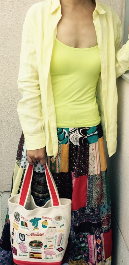 今日は、暑かったので、ユニクロのリネンシャツ+ブラトップ+インド製のスカート+マヨルカのエコバッグ。という布陣。