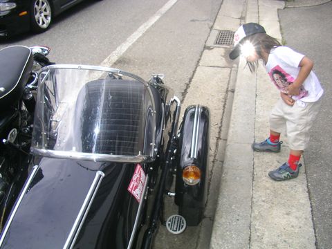 道で、サイドカー付きのバイクを見かけて、興味津々の次女。
